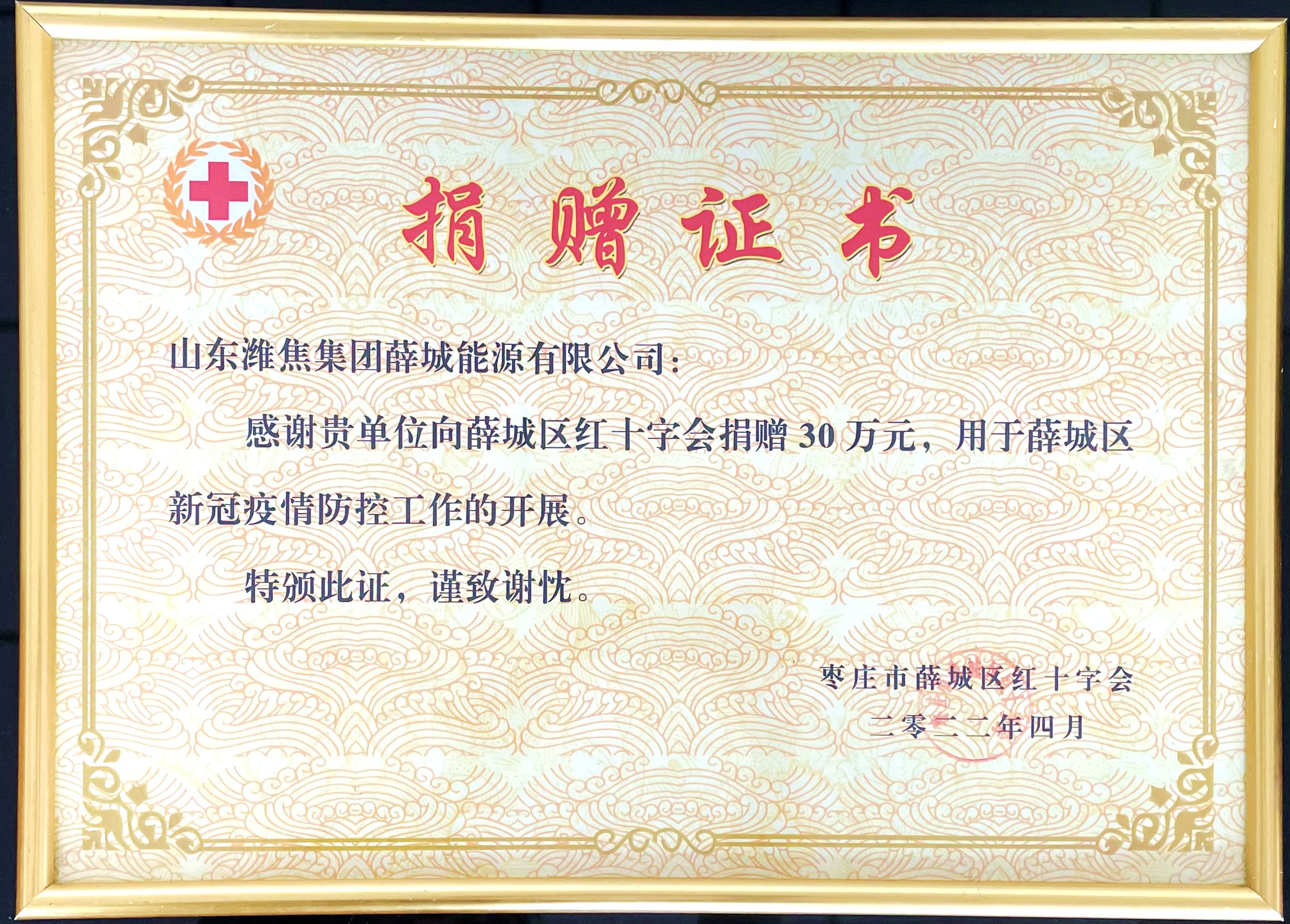 4月11日,薛城能源公司收到棗莊市薛城區(qū)紅十字會頒發(fā)的捐贈證書及區(qū)委統(tǒng)籌疫情防控和經濟運行工作領導小組發(fā)來的感謝信,感謝企業(yè)為地區(qū)疫情防控慷慨捐贈30萬元!