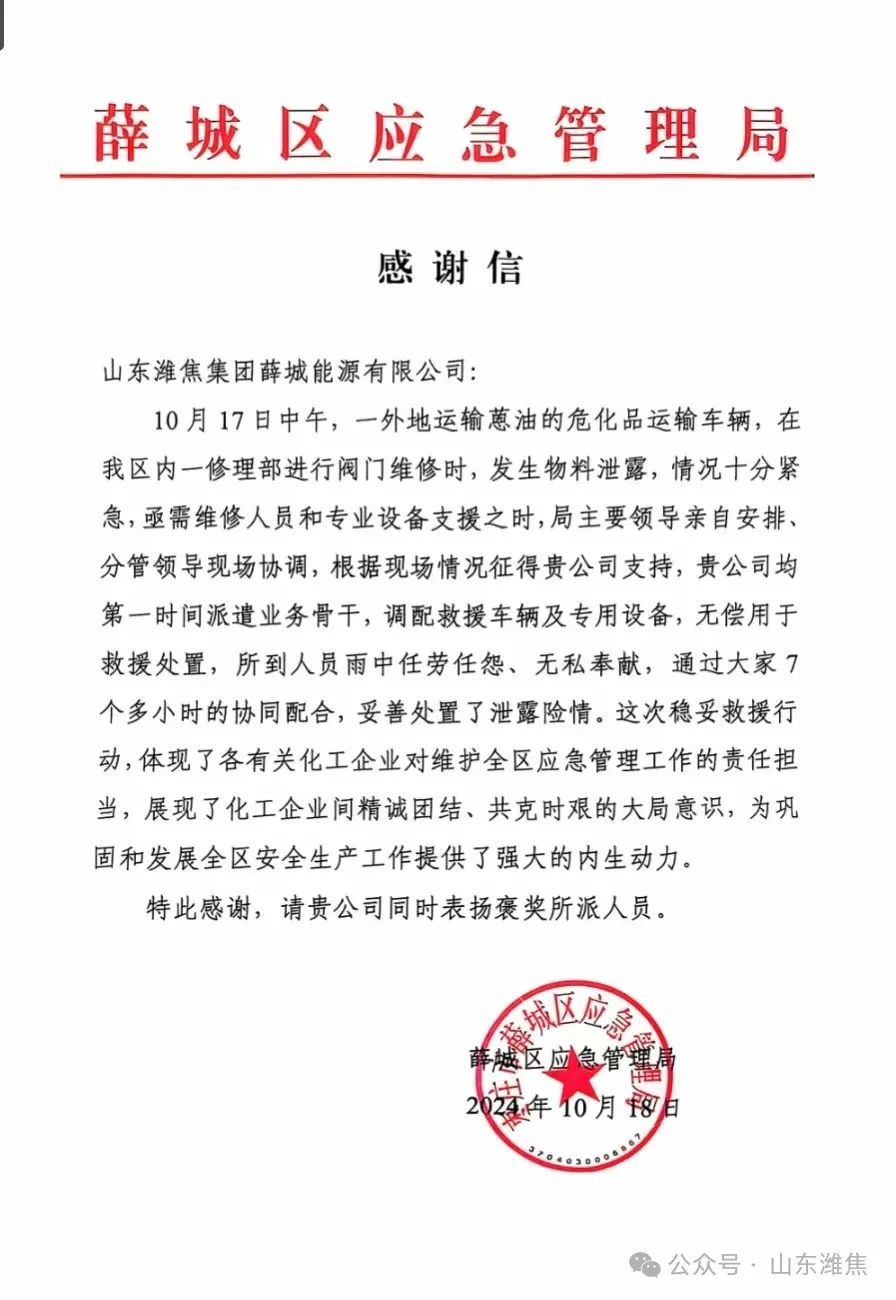 10月18日上午,薛城區(qū)應(yīng)急管理局黨 委書(shū) 記、局長(zhǎng)王鋒,副局長(zhǎng)張海龍一行向薛城能源公司送來(lái)感謝信,副總經(jīng)理陳兆財(cái)?shù)葻崆榻哟?/div>